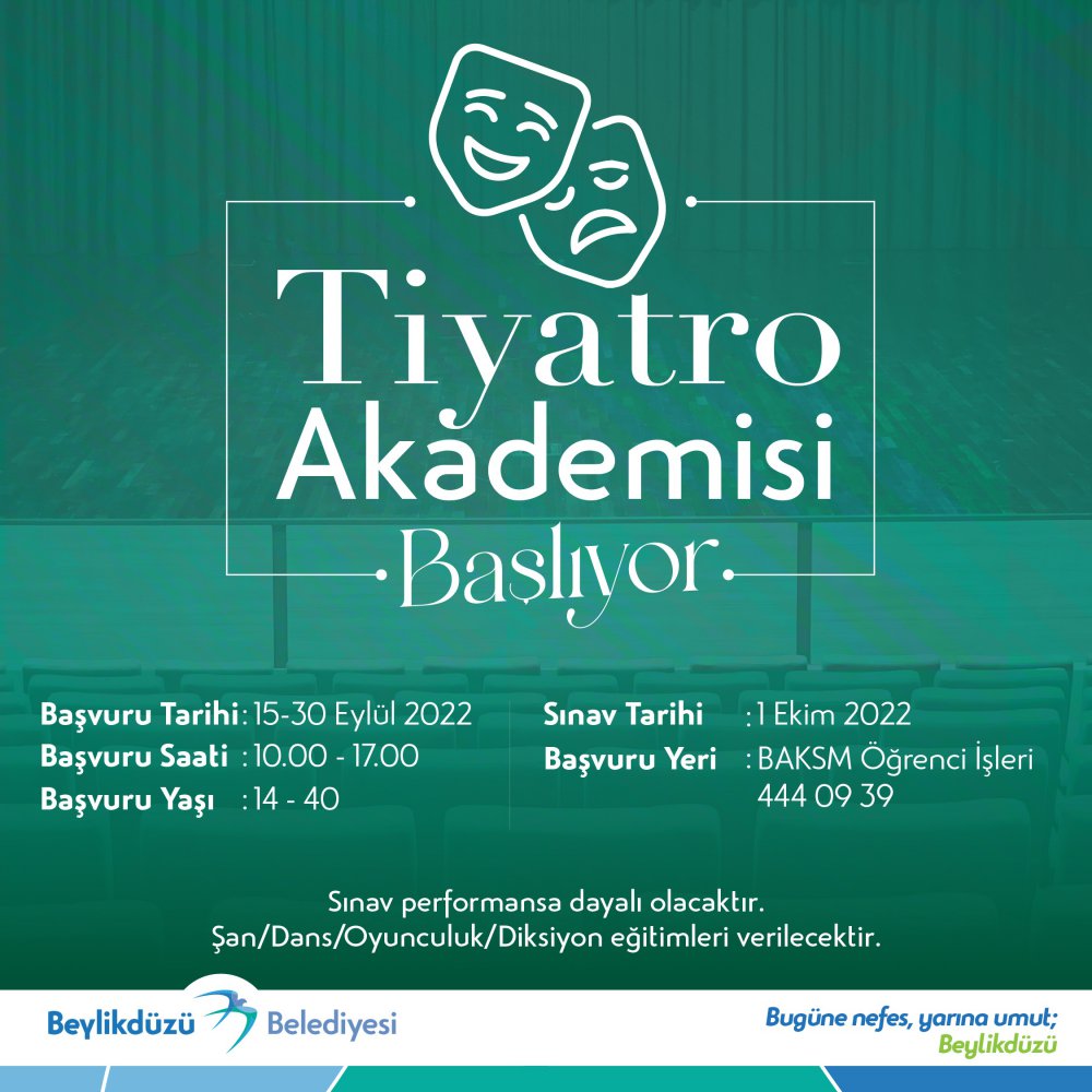 Gençleri sanata teşvik etmek amacıyla faaliyet gösteren Orkestra ve Koro’nun yanı sıra Tiyatro Akademisi için de yeni dönem başvuruları başladı. Tiyatroya gönül verenleri bir araya getiren akademide; diksiyon, dans, oyunculuk ve şan eğitimleri verilecek. 14-40 yaş arası vatandaşların 30 Eylül’e kadar başvurabileceği akademinin performansa dayalı seçme sınavı ise 1 Ekim’de gerçekleşecek. Tüm başvurular; Beylikdüzü Atatürk Kültür ve Sanat Merkezi öğrenci işleri ya da belediyenin 444 09 39 no’lu çağrı merkezi üzerinden yapılabilecek. Orkestra ve Koro için ayrıca, sosyal medya hesapları üzerinden de başvuru alınacak.
