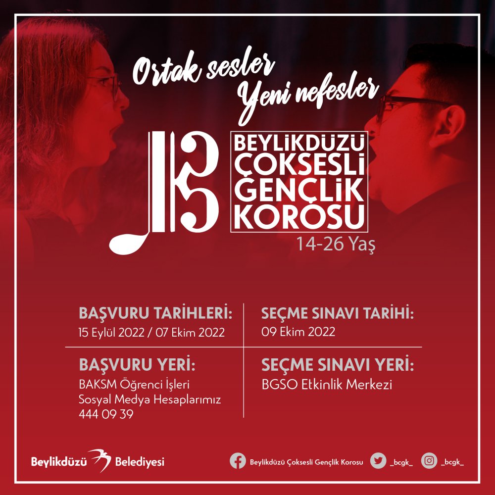 Beylikdüzü Belediyesi Kültür İşleri Müdürlüğü bünyesinde faaliyetlerini sürdüren Beylikdüzü Gençlik Senfoni Orkestrası, Beylikdüzü Çoksesli Gençlik Korosu ve Tiyatro Akademisi yeni yeteneklerini arıyor. Gençlere müzik sevgisini aşılamak amacıyla kurulan ve şimdiye kadar pek çok festivalde Beylikdüzü’nü başarıyla temsil eden Beylikdüzü Gençlik Senfoni Orkestrası (BGSO) ve Beylikdüzü Çoksesli Gençlik Korosu (BÇGK)’nun yeni sezon başvuruları başladı. BGSO’ya katılmak isteyenler keman, viyola, viyolonsel, kontrbas, flüt, obua, fagot, klarnet, trompet, korno, trombon, vurmalı çalgılar ve tuba branşlarından başvuru yapabilecek. 14-26 yaş arasındaki gençlerin katılabileceği ve 7 Ekim’e kadar süren başvuruların ardından seçme sınavları; BGSO için 8 Ekim, BÇGK içinse 9 Ekim tarihinde gerçekleşecek.