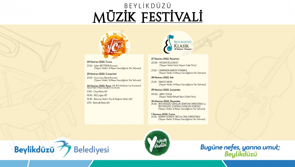 Beylikdüzü Belediyesi tarafından geleneksel hale gelen festivalleri bir araya getiren Beylikdüzü Müzik Festivali başlıyor. Caz ve klasik müzikseverleri Yaşam Vadisi’nde buluşturacak olan festivalde ilk olarak bu yıl dördüncüsü düzenlenecek olan Beylikdüzü Caz Günleri, caz müziğin önemli isimlerini 6 Mayıs Gençliğimiz Var Sahnesi’nde ağırlayacak. 24-26 Haziran tarihleri arasında düzenlenecek olan festivalin ilk gününde caz müziğin güçlü seslerinden Selen Beytekin sahne alacak. Festivalin ikinci gününde ise Küba Latin Caz Grubu A lo Loco Band ile Yaşam Vadisi Küba ezgileri ile yankılanacak. Beylikdüzü Caz Günleri’nin kapanışını ise İKSV’nin yeşille cazı bir araya getirdiği Parklarda Caz etkinliği yapacak.