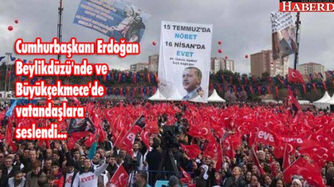 Erdoğan, vatandaşlara 16 Nisan'da Evet diyor musunuz? diyerek seslendi; "İstanbul'un ve ülkemizin aydınlık geleceği için 16 Nisan'da Beylikdüzü büyük Türkiye için evet diyor mu? Müreffeh Türkiye için evet diyor mu? İstikrar için evet diyor mu? Güven için evet diyor mu?" dedi.