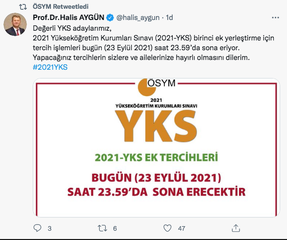 Aygün Twiter hesabından yaptığı paylaşımda, "Değerli YKS adaylarımız, 2021 Yükseköğretim Kurumları Sınavı (2021-YKS) birinci ek yerleştirme için tercih işlemleri bugün (23 Eylül 2021) saat 23.59’da sona eriyor. Yapacağınız tercihlerin sizlere ve ailelerinize hayırlı olmasını dilerim" ifadesini kullandı.