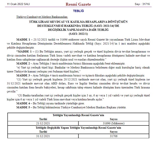 Merkez Bankası tarafından 'Türk Lirası Mevduat ve Katılma Hesaplarına Dönüşümün Desteklenmesi Hakkında Tebliğ' ve 'Altın Hesaplarından Türk Lisarı Mevduat ve Katılma Hesaplarına Dönüşümün Desteklenmesi Hakkında Tebliğ'inde yapılan değişiklikler Resmi Gazete'de yayımlandı.