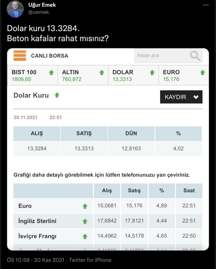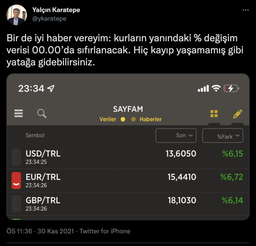 Prof. Dr. Yalçın Karatepe: Kasım ayının bitmesine hala yarım saat var ama dolar bu ay %43 arttı. Bir de iyi haber vereyim: kurların yanındaki % değişim verisi 00.00’da sıfırlanacak. Hiç kayıp yaşamamış gibi yatağa gidebilirsiniz.