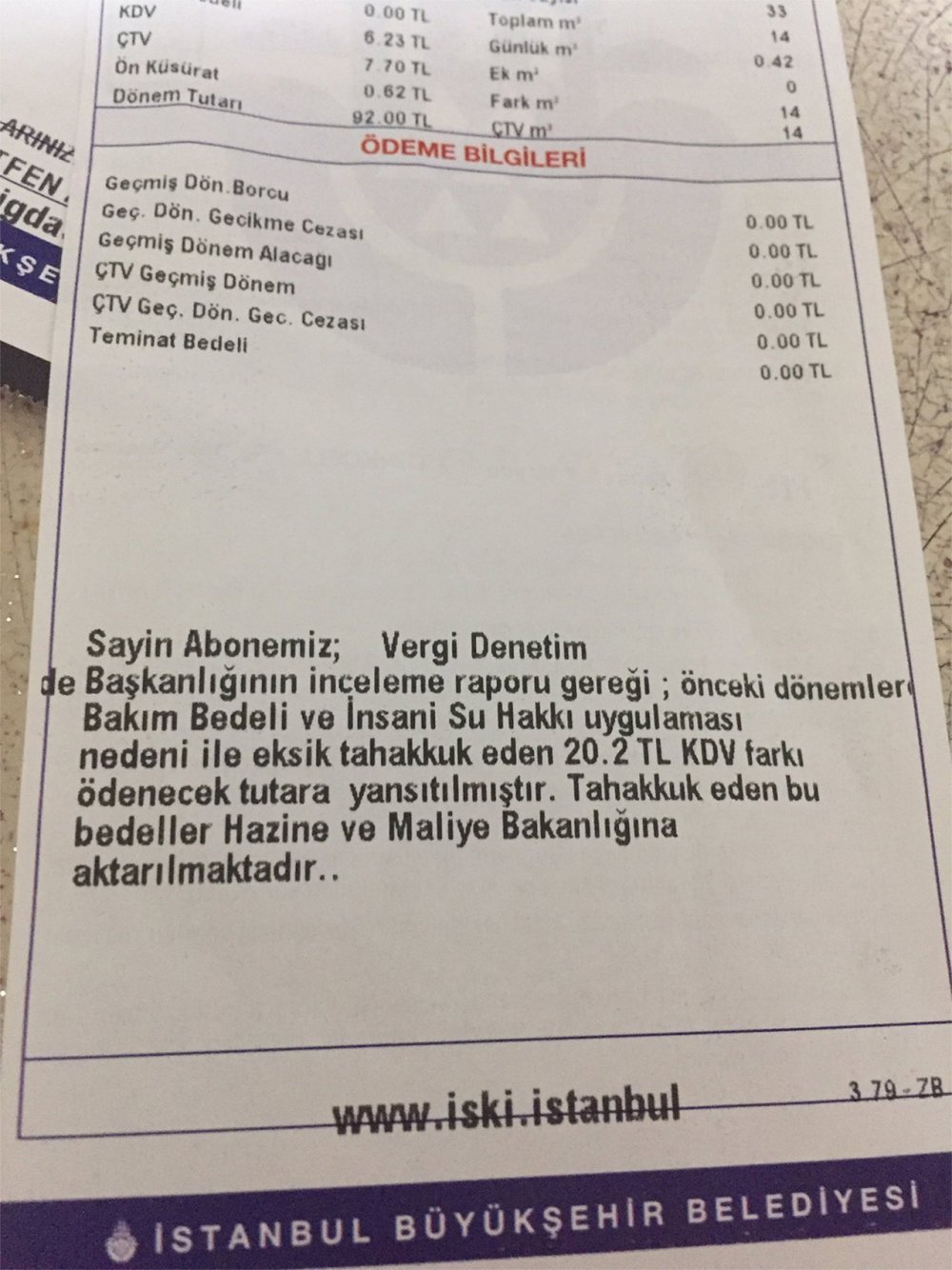 İSKİ'nin hazırladığı su faturalarında yer alan notta, "Sayın Abonemiz; Vergi Denetim Başkanlığı'nın inceleme raporu gereği; önceki dönemlerde Bakım Bedeli ve İnsani Su Hakkı uygulaması nedeni ile eksik tahakkuk eden 20,02 TL KDV farkı ödenecek tutara yansıtılmıştır. Tahakkuk eden bu bedeller Hazine ve Maliye Bakanlığı'na aktarılmaktadır" yazıyor.