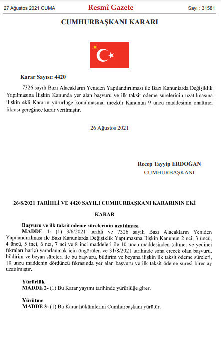 Resmi Gazete'nin bugünkü sayısında yer alan Cumhurbaşkanı kararına göre; bazı kamu alacaklarının yeniden yapılandırılması için ön görülen son başvuru ve ilk taksit ödeme süresi 31 Ağustos 2021 tarihinden 1 ay sonrasına ertelendi.