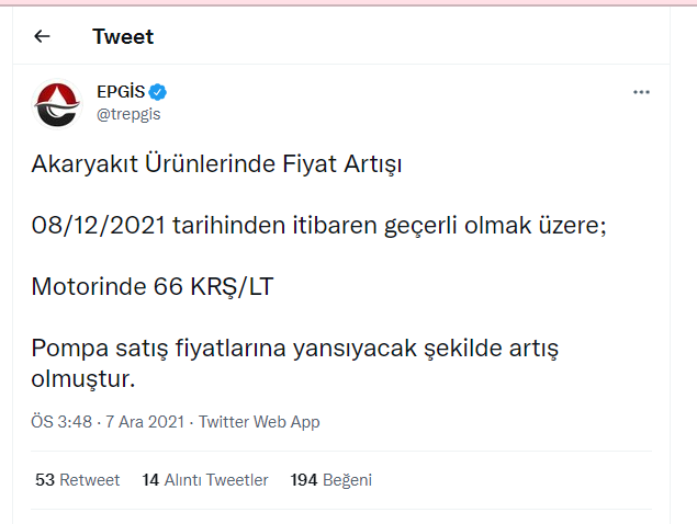Açıklamada, "Akaryakıt Ürünlerinde Fiyat Artışı 08/12/2021 tarihinden itibaren geçerli olmak üzere; Motorinde 66 KRŞ/LT Pompa satış fiyatlarına yansıyacak şekilde artış olmuştur." ifadeleri kullanıldı.