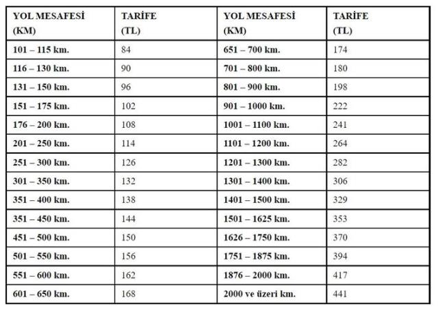 Tebliğe göre 101-115 km arası seyahatlerde 84 TL'den başlayan tavan fiyat 2,000 km üzerinde 441 TL ile son buluyor.