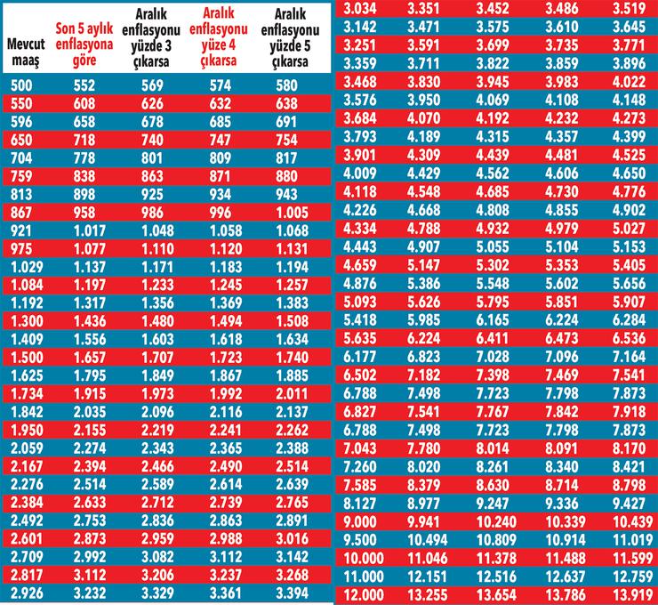 Geriye sadece aralık ayı enflasyonu kaldı. Kur ve hammadde etkisiyle aralık enflasyonunun da kasımın üzerinde çıkabileceği ifade ediliyor. Merkez Bankası beklenti anketine göre aralık için enflasyon öngörüsü yüzde 3.37 seviyesinde. Kabaca yüzde 3-5 arasında beklenti olduğunu söyleyebiliriz. Bu beklentiye paralel 6 aylık enflasyonun da yüzde 13.70-16.00 arasında gerçekleşeceği hesaplanıyor. Yani maaşlara bu oranda zam yansıtılacak. Bunlara ilave olarak emekli maaşında iyileştirme de öngörülüyor.