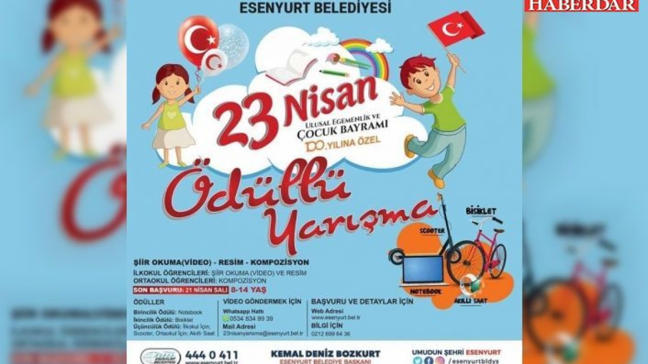 Esenyurtlu çocuklar başvuruların ücretsiz olduğu yarışmanın detaylı bilgilerine ve yarışma şartnamesine www.esenyurt.bel.tr<.esenyurt.bel.tr/> internet sitesinden ulaşılabilecek. İlkokul öğrencileri, 23 Nisan temalı Resim ve Şiir Okuma alanında, ortaokul öğrencileri ise, Kompozisyon Yazma alanında başvuru yapabilecek. Şiir okumaları videolu olarak, resim ve kompozisyon yazıları ise, fotoğraflı olarak belirtilen adreslere son başvuru tarihine kadar iletilebilecek.