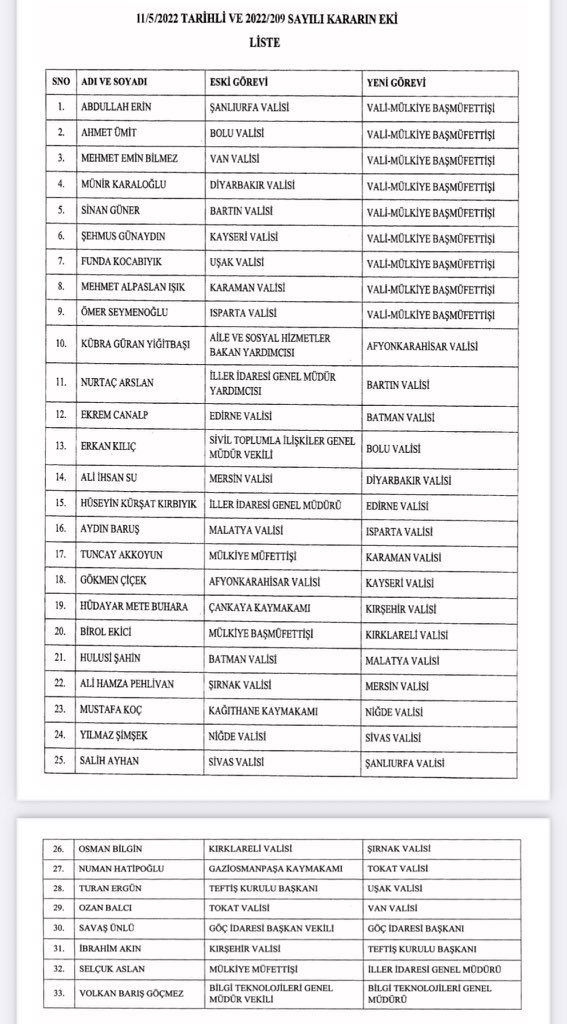 Resmi Gazete'nin bugünkü sayısında yayınlanan Cumhurbaşkanlığı Kararnamesi ile Şanlıurfa, Bolu, Van, Diyarbakır, Bartın, Kayseri, Uşak, Karaman ve Isparta valileri görevden alındı.