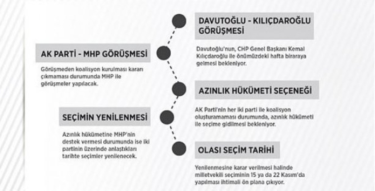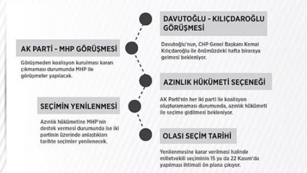 AK Parti'nin her iki parti ile koalisyon oluşturamaması durumunda, azınlık hükümeti ile seçime gidilmesi bekleniyor. Azınlık hükümetine MHP'nin destek vermesi durumunda ise iki partinin üzerinde anlaştıkları tarihte seçimler yenilenecek.