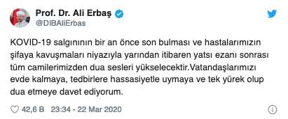 "Koronavirüs (Kovid-19) salgınının bir an önce son bulması ve hastalarımızın şifaya kavuşmaları niyazıyla yarından itibaren yatsı ezanı sonrası tüm camilerimizden dua sesleri yükselecektir. Vatandaşlarımızı evde kalmaya, tedbirlere hassasiyetle uymaya ve tek yürek olup dua etmeye davet ediyorum."
