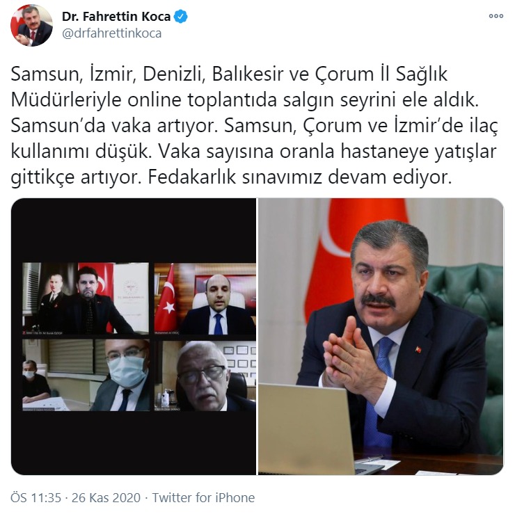 "Samsun, İzmir, Denizli, Balıkesir ve Çorum İl Sağlık Müdürleriyle online toplantıda salgın seyrini ele aldık. Samsun'da vaka artıyor. Samsun, Çorum ve İzmir'de ilaç kullanımı düşük. Vaka sayısına oranla hastaneye yatışlar gittikçe artıyor. Fedakarlık sınavımız devam ediyor."