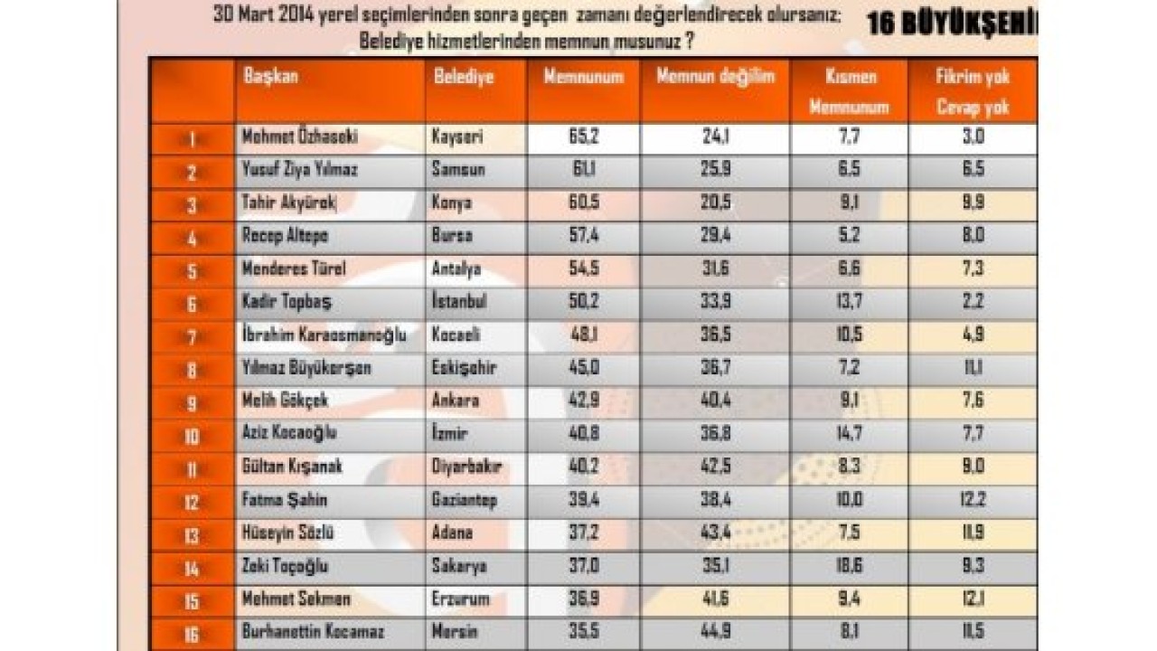 30 Mart yerel seçimlerinden sonra yapılan en kapsamlı 'memnuniyet' anketi, 30 büyükşehirde 27 bin 356 kişi ile yapıldı. Araştırmada vatandaşlara "30 Mart 2014 yerel seçimlerinden sonra geçen zamanı değerlendirecek olursanız; Belediye hizmetlerinden memnun musunuz?" sorusu yöneltildi. Kayseri Büyükşehir Belediye Başkanı Mehmet Özhaseki'nin en fazla desteği aldığı sıramalada, Samsun Büyükşehir Belediye Başkanı Yusuf Ziya Yılmaz ikinci sırada, Konya Büyükşehir Belediye Başkanı Tahir Akyürek üçüncü sırada yer aldı.