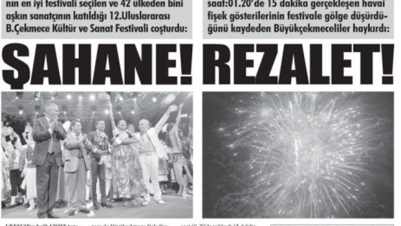 Geçtiğimiz yıl Büyükçekmece’de gece yarısı saat 01.20’de yaklaşık 15 dakika yüksek sesli havai fişek patlatma rezaleti yaşandığını HABERDAR yayınlamıştı. Haberde, 12. Uluslar arası Kültür ve Sanat Festivali’nin 6. günüde (9 Temmuz 2011Cumartesi) saat 01.20’de yaklaşık 15 dakika devam eden yüksek sesli havai fişek gösterilerine vatandaşların tepkisi dile getirilmişti.