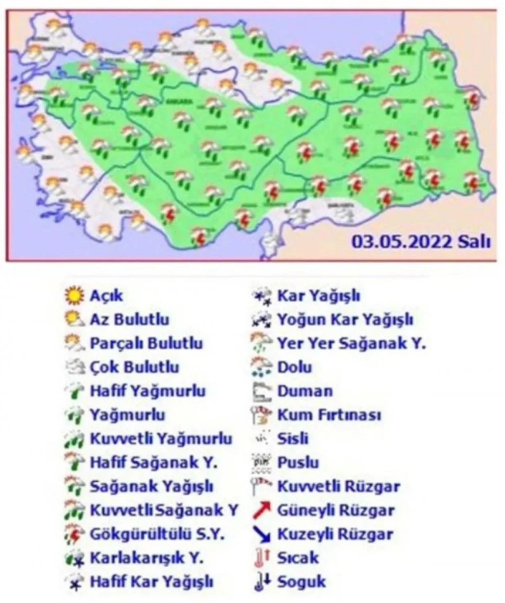 Göller Yöresi, İç Anadolu’nun batısı, Batı ve Doğu Karadeniz’in iç kesimleri, (Malatya hariç) Doğu Anadolu, Güneydoğu Anadolu’nun doğusu ile Afyonkarahisar ve Kütahya çevrelerinin yerel sağanak ve gök gürültülü sağanak yağışlı, diğer yerlerin az bulutlu ve açık geçeceği tahmin ediliyor.