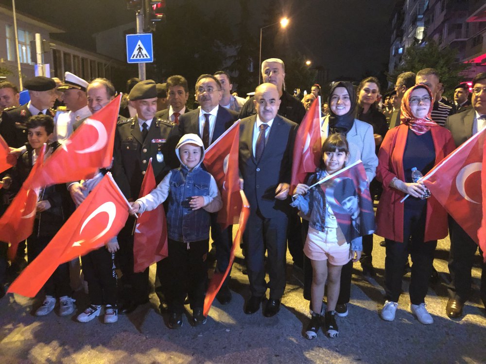 Bandoların çaldığı marşlarla yürüyen kalabalığa evlerindeki vatandaşlar da balkon ve pencerelerden alkışlarla destek verdi.