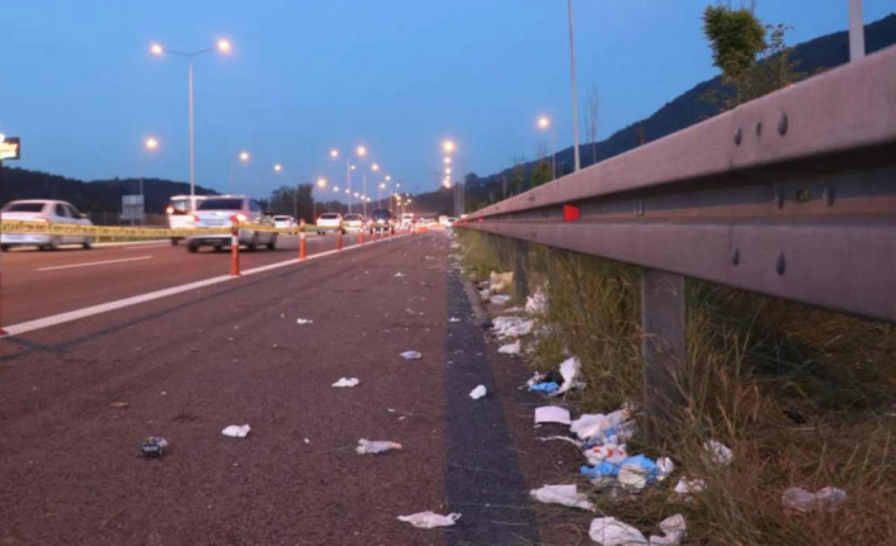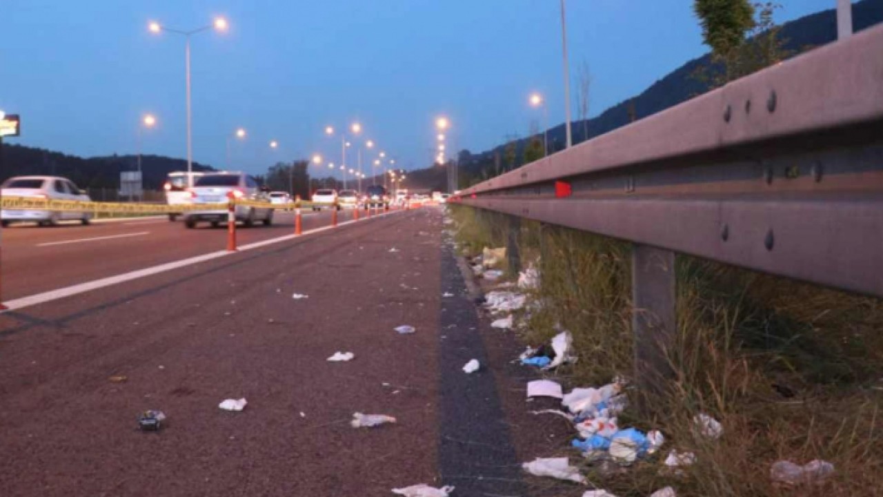 Otoyolun emniyet şeridinde metrelerce görülen çöpler çevre kirliliği oluşturuyor.