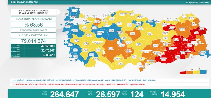 Sağlık Bakanlığının paylaştığı haritada, hedef nüfusun yüzde 75 ve üzerinin aşılandığı iller mavi renkle gösteriliyor. Muğla, Çanakkale, Kırklareli, Edirne, Balıkesir, Amasya, Eskişehir, Aydın, Tekirdağ, İzmir, Bilecik, Ankara, Hakkari, Ordu, Yalova, Bartın, Burdur ‘mavi iller’ arasında bulunuyor.