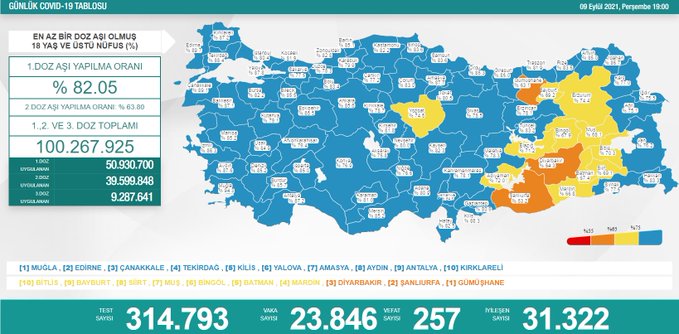 "Vaka sayımız 23.846. Dünle bugün arasında lehimize 68 fark var. Dün 262 olan can kaybımız, bugün 257. Acı haberin sayısı azaldı. Bu farklarda, sayılarla ifade edilemeyecek sonuçlar var. Hayat var. Bugün 100 milyon doz aşıya ulaştık. Birlikte bu tabloyu tümden değiştirebiliriz."