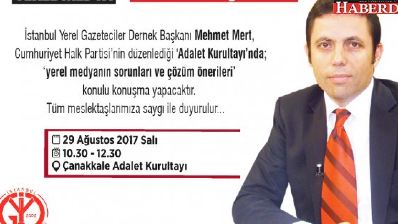 İstanbul Yerel Gazeteciler Derneği Yönetim Kurulu Başkanı Mehmet Mert, Cumhuriyet Halk Partisi'nin düzenlediği 'Adalet Kurultayı'nda konuşma yapacak... 29 Ağustos 2017 Salı günü saat 10.30-12.30 arası gerçekleşecek panel Halk TV'den de canlı yayınlanacak...