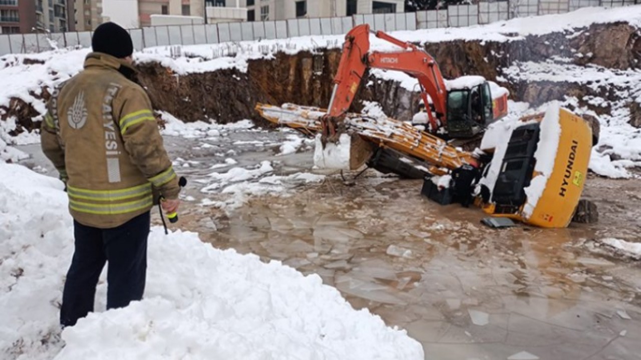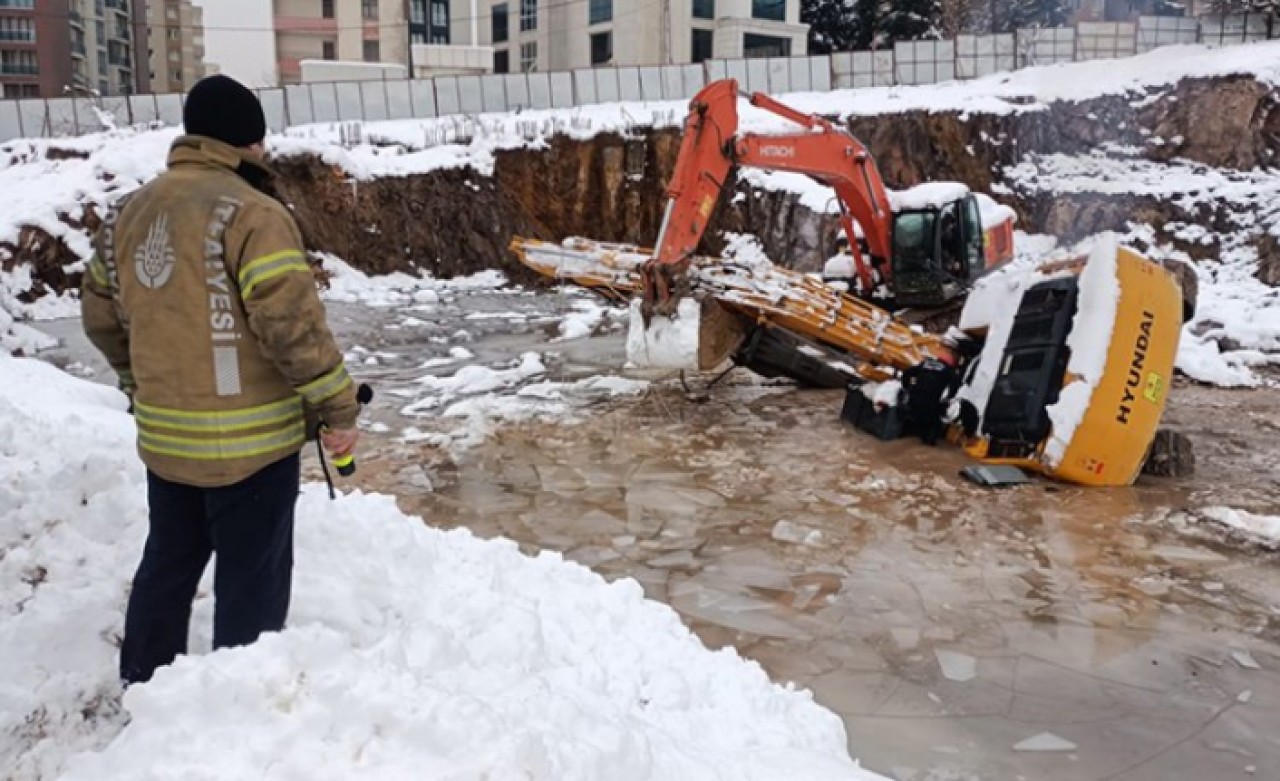 Ataşehir'de bir inşaat alanında iş makinesi üstü buzla kaplanan su dolu alana düştü. Suya gömülen iş makinesinin operatörünün kaybolduğu belirtilirken itfaiyenin su içinde arama çalışması yapıldı.
