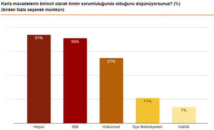 Ankete göre İstanbulluların %37'si, sorumluluğun tüm kurumlarda olduğunu ifade etti. Yüzde 35'lik kısım sorumluluk İBB'de derken yüzde 27'lik kısım ise sorumluluğun hükümette olduğunu söyledi.