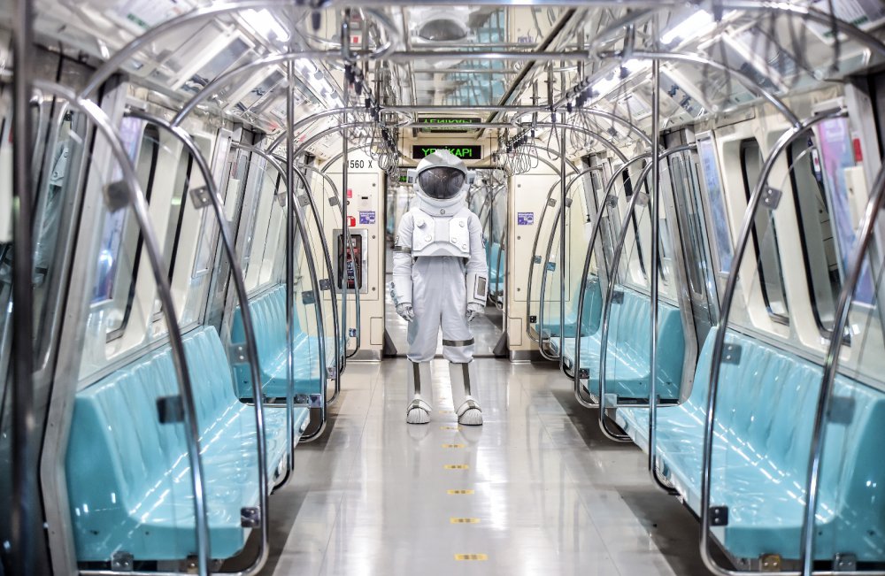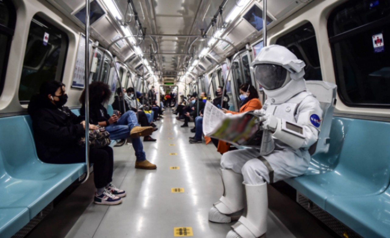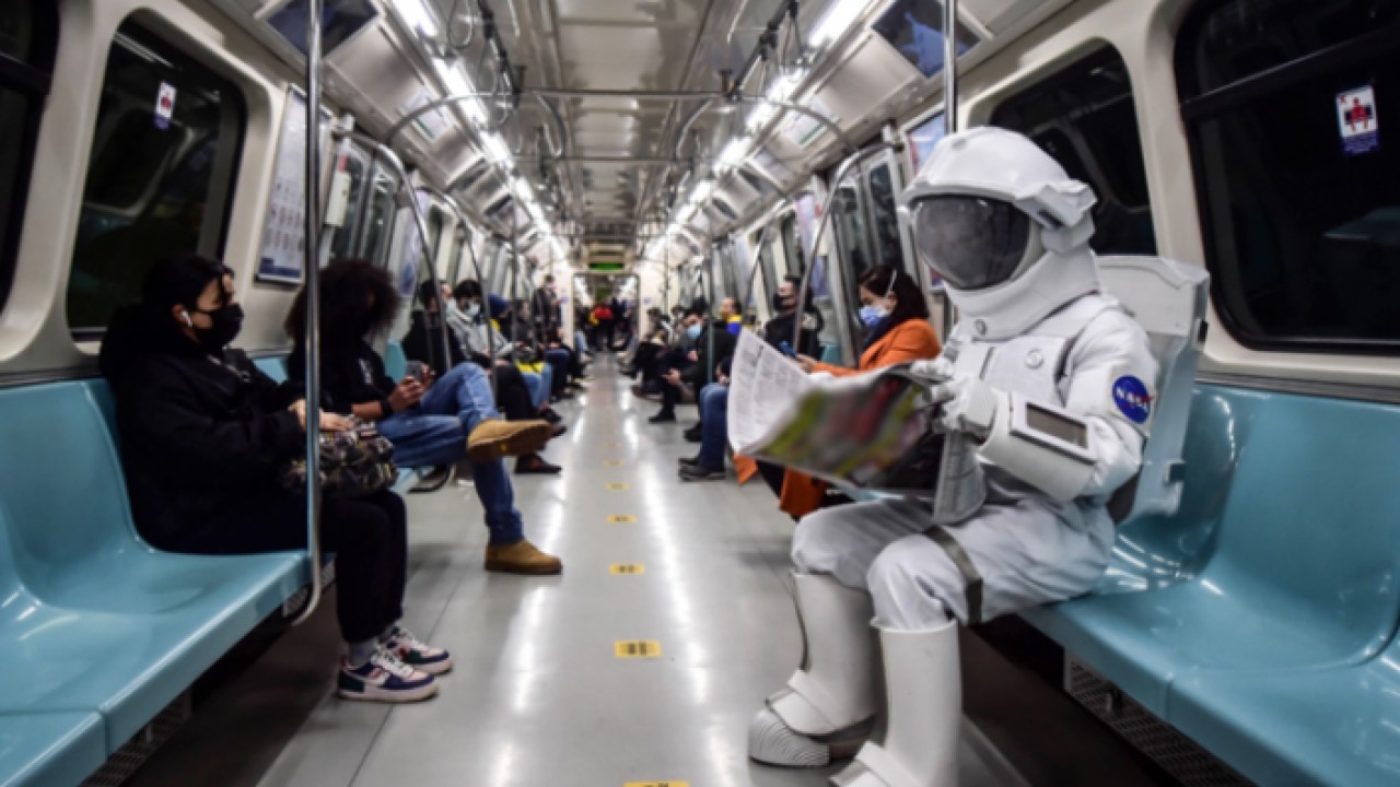 İstanbul'da metroda astronot kıyafetiyle dolaşan bir kişi, görenleri şaşırttı.