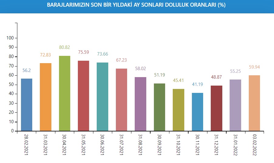 İstanbul'daki barajların doluluk oranı 3 Şubat itibariyle yüzde 59,94 olarak ölçüldü.