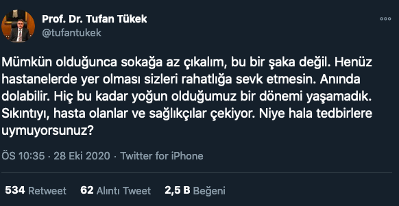 Tükek, "Mümkün olduğunca sokağa az çıkalım, bu bir şaka değil. Henüz hastanelerde yer olması sizleri rahatlığa sevk etmesin. Anında dolabilir. Hiç bu kadar yoğun olduğumuz bir dönemi yaşamadık. Sıkıntıyı, hasta olanlar ve sağlıkçılar çekiyor. Niye hala tedbirlere uymuyorsunuz?" dedi.