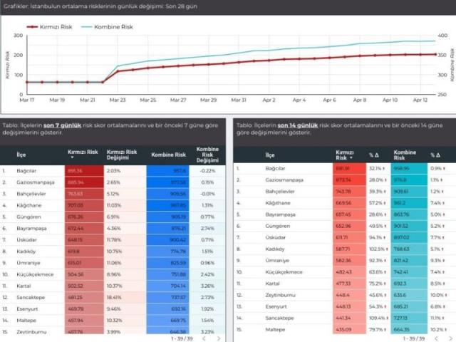 Sağlık Bakanlığı'nın Hayata Eve Sığar uygulaması, kentlerdeki farklı bölgelerin risk durumunu renkler üzerinden açıklıyor.Uygulama, İstanbul'da yüksek risk anlamına gelen kırmızı rengin son dönemde yoğun olarak arttığını gösteriyor.İstanbul Aile Hekimleri Derneği, bu uygulamadaki renklere dayanarak İstanbul'daki risk durumuyla ilgili bir tahmin ve modelleme çalışması yaptı.Hem bütün kenti hem de ilçe ve mahalleleri inceleyen bu çalışmaya göre İstanbul'da kırmızı risk puanı en yüksek olan ilçelerin başında Bağcılar geliyor.Bağcılar'ı Gaziosmanpaşa, Bahçelievler, Kağıthane, Güngören ve Bayrampaşa takip ediyor.