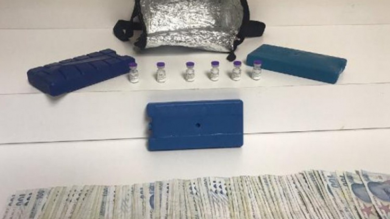K.D.'nin elindeki poşetin içerisinde hastanelerde aşı olarak koronavirüs tedavisinde kullanıldığı değerlendirilen ve üzerinde "Pfizer-Biontech COVİD-19 Vaccine" ibaresi bulunan 6 adet aşı ele geçirildi.