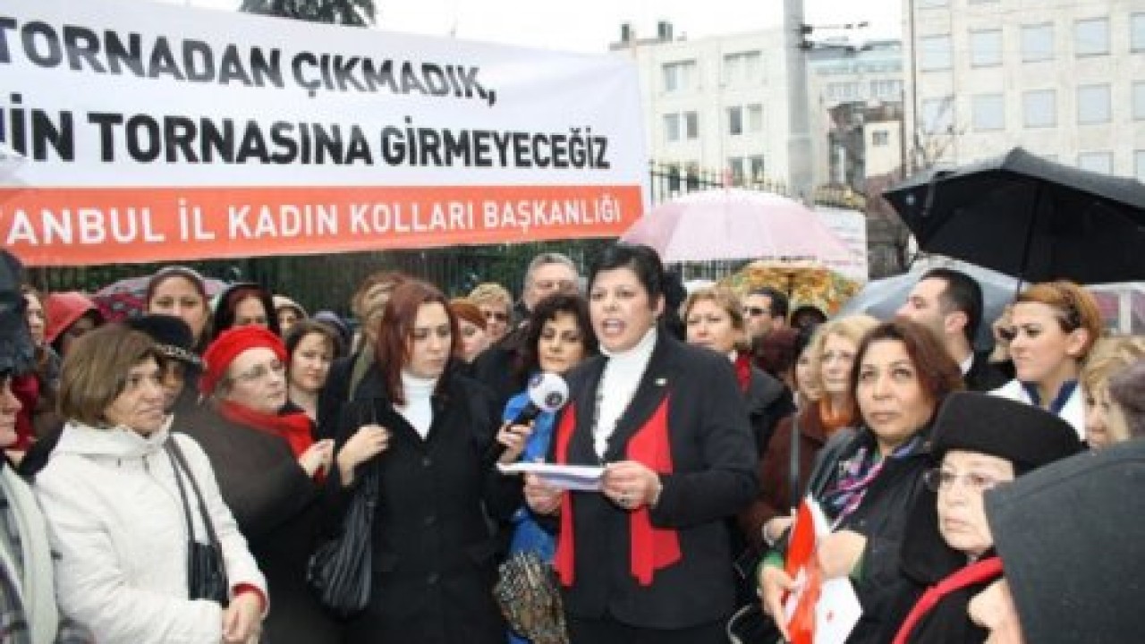 “Tornadan çıkmadık, kimsenin tornasına girmeyeceğiz” yazılı pankartların açıldığı eylemde, basın açıklamasını tüm kadınlar adına CHP İstanbul İl Kadın Kolu Başkanı Fevziye Pehlivan okudu.