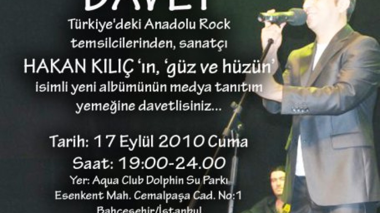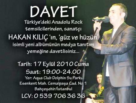 HABERDAR gazetesi genel yayın yönetmeni Mehmet Mert’i de bu yemeye davet eden Hakan Kılıç ‘Çok nezih bir yemek olacak. Yaklaşık 500 kadar seçkin dostumu ağırlayacağım bu yemekte. Yıllardır Rock müzik alanında yaptığım çalışmaların eseri olarak çıkardığım yeni albüm; ‘Güz ve hüzün’ü de müzikseverlerin beğeneceğini umuyorum.’ Dedi.