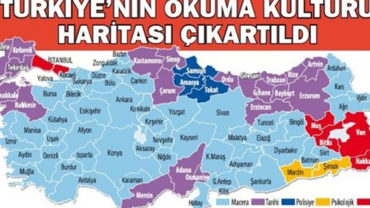 İstanbul, Hakkari, Van, Bitlis ve Muş, ‘aşk’, Samsun, Amasya, Çorum ve Tokat ‘polisiye’, Siirt, Batman, Şırnak ve Mardin, ‘psikoloji’ temalı kitap okurken, Türkiye genelinde ise ‘macera’ tercih ediliyor.
