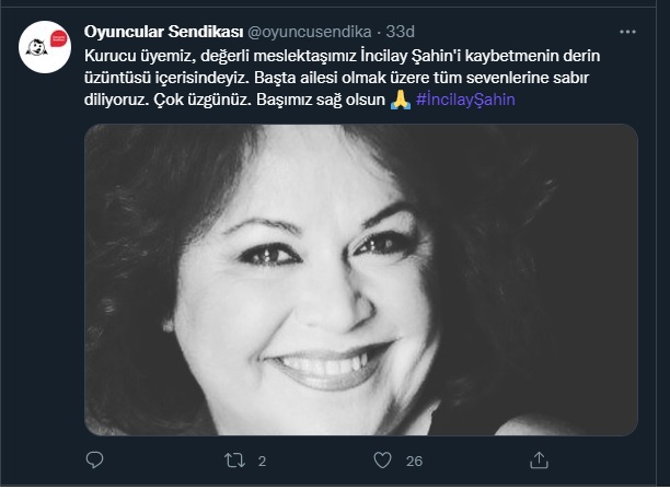 "Kurucu üyemiz, değerli meslektaşımız İncilay Şahin'i kaybetmenin derin üzüntüsü içerisindeyiz. Başta ailesi olmak üzere tüm sevenlerine sabır diliyoruz. Çok üzgünüz. Başımız sağ olsun..."