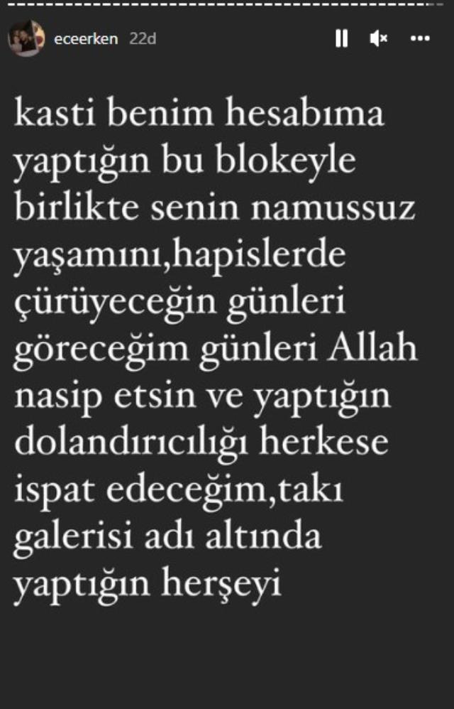 "Ben Ece Erken Mahmutyazıcıoğlu ise bu işin peşini bırakmayacağım. Kaçakçılık yapan, daha önce hapis yatan şerefsizle her türlü savaşacağım. B. Yakın'la ilişkinden, Küçükçekmece'de açtığın mekana kadar çıkartacağım. Şafak bizi görüyorsa sana aynen şerefsiz diyordur ve Allah bize ne yaşattıysan yaşatsın sana. Çocuklarından utanmayan şeref yoksunu."