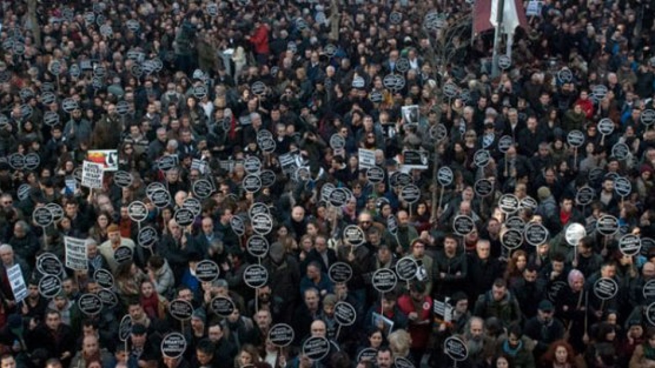 Agos'un penceresinden binlerce kişiye seslenen Murathan Mungan, "Hrant Dink siyasi cinayetlere kurban giden 62. gazeteci" dedi.