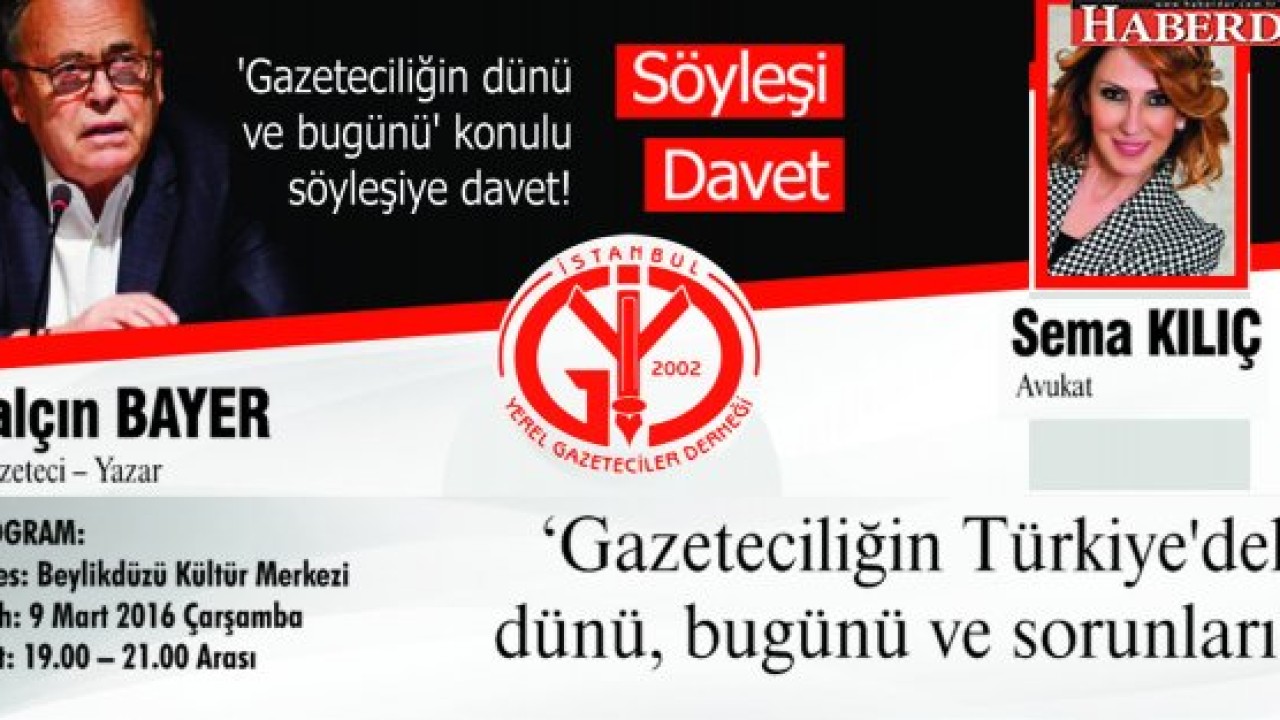 İYGAD, söyleşi etkinliğine Hürriyet Gazetesi Yazarı Yalçın Bayer ile devam ediyor. Ünlü yazarın konuk olacağı program 9 Mart Çarşamba günü saat 19.00'da Beylikdüzü Kültür Merkezi'nde gerçekleştirilecek. "Gazeteciliğin dünü, bugünü ve yarını" başlığı altında anlatım yapacak olan Bayer, gazetecilerin sorularını da yanıtlayacak.