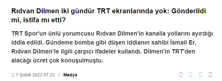 İddianın sahibi gazeteci İsmail Er sosyal medya hesabından yaptığı paylaşımda, %100 Futbol programına sponsor olan firmanın sahibi hakkında Rıdvan Dilmen'in konuşmalar yaptığı ve bu durumdan rahatsız olan firmanın sponsorluktan çekilmesi sonrası TRT'nin de ünlü yorumcunun işine son verdiğini belirtti.