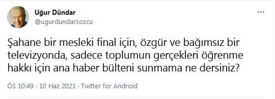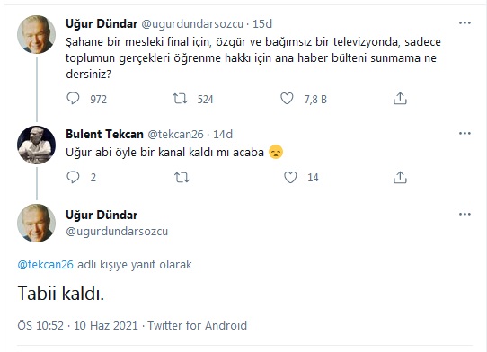 Uğur Dündar daha sonra bir takipçisinin "Uğur abi öyle bir kanal kaldı mı acab?" sorusuna ise, "Tabii kaldı" yanıtını verdi.