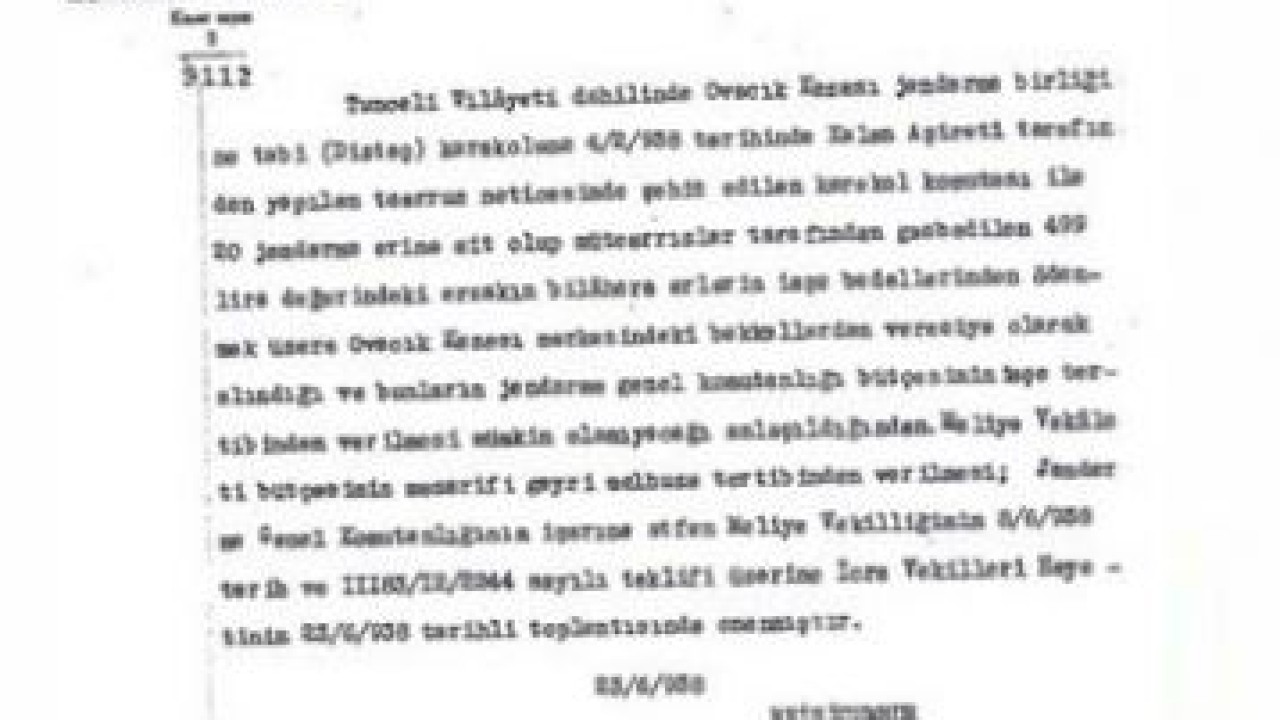“Tunceli vilayeti dahilinde Ovacık Kazası jandarma birliğine tabi Diztaş karakoluna 4/2/938 tarihinde Kalan Aşireti tarafından yapılan taarruz neticesinde şehit edilen karakol komutanı ile 20 jandarma erine ait olup mütaarrızlar tarafından gasbedilen 499 lira değerindeki erzakın bilahare erlerin iaşe bedellerinden ödenmek üzere Ovacık Kazası merkezindeki bakkallardan veresiye olarak alındığı ve bunların Jandarma Genel Komutanlığı bütçesinin iaşe tertibinden verilmesi mümkin olamıyacağı anlaşıldığından, Maliye Vekaleti bütçesinin masarifi gayri melhuza tertibinden verilmesi; Jandarma Genel Komutanlığı’nın işarına atfen Maliye Vekilliği’nin teklifi üzerine İcra Vekilleri Heyeti’nin 23/6/938 tarihli toplantısında onanmıştır.”