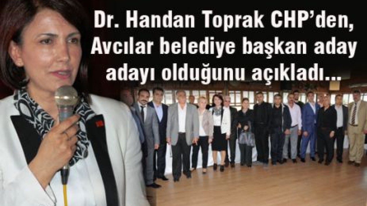 Avcılar’da 20 yıldır sağlık sektöründe hizmetler veren ve aynı zamanda CHP İstanbul İl Kadın kollarında sağlıktan sorumlu başkan yardımcılığı görevini yürüten Dr. Handan Toprak Avcılar belediye başkan aday adayı olduğunu açıkladı.