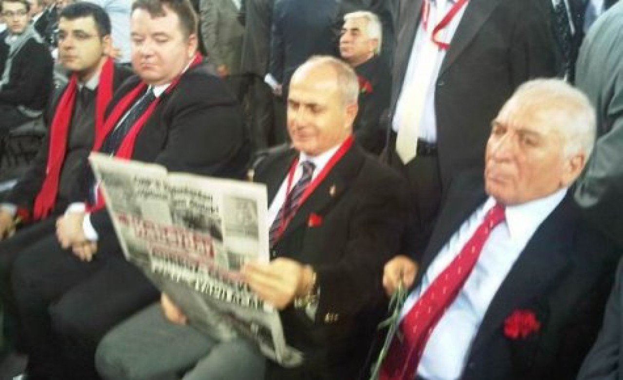 Satta: 10.25 -- Zonguldak'tan gelen bir grup madenci, kurultayı başlarındaki sarı baretler ile izliyor.