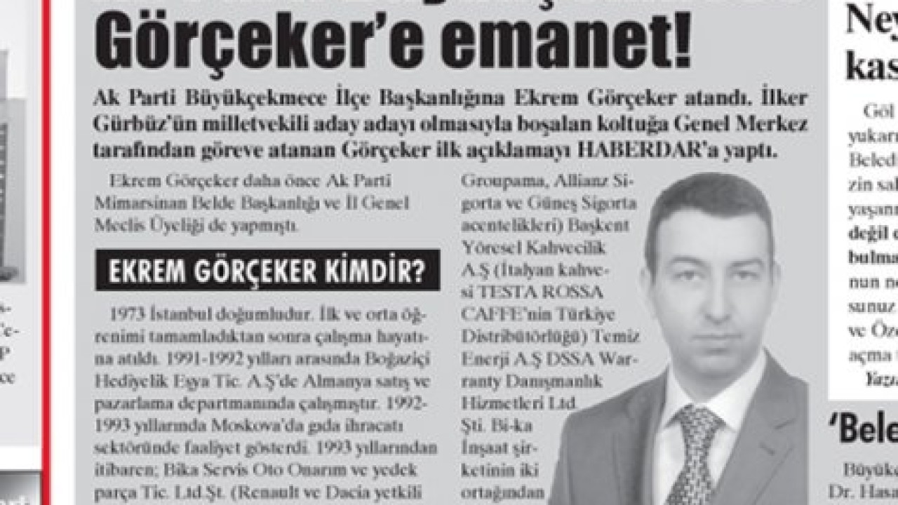 Ak Parti Büyükçekmece İlçe Başkanlığına Ekrem Görçeker atandı. İlker Gürbüz’ün milletvekili aday adayı olmasıyla boşalan koltuğa Genel Merkez tarafından göreve atanan Görçeker ilk açıklamayı HABERDAR’a yaptı…