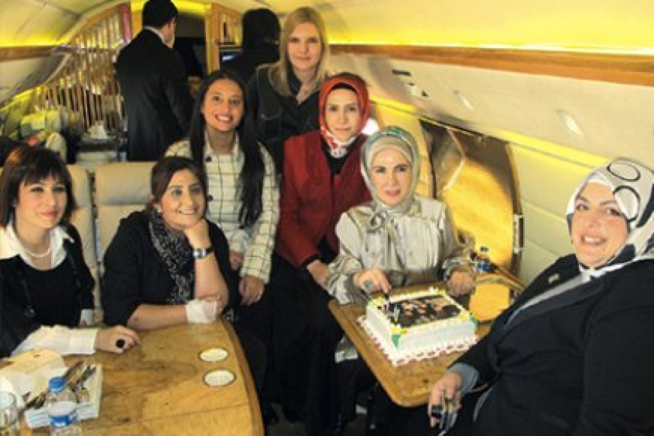 Crans Montana Forumu, Başbakan Erdoğan'ın eşi Emine Erdoğan'a Brüksel'de ödül verdi. Erdoğan ödülü, tam doğum gününde aldı... Başbakan'ın eşi Emine Erdoğan, dün 56 yaşına girdi. Brüksel'e ATA uçağıyla giden Emine Erdoğan'a uçakta sürpriz doğum günü kutlaması yapıldı. AB'den sorumlu Başmüzakereci Devlet Bakanı Egemen Bağış ile eşi Beyhan Bağış, Emine Erdoğan'a bir buket beyaz çiçek verdiler. Emine Erdoğan, üzerinde çocukları ve torunlarıyla çekilmiş bir aile fotoğrafının da yer aldığı pastayı kesti... Emine Erdoğan'a bu seyahatinde kızı Sümeyye Erdoğan, Devlet Bakanı Egemen Bağış ile eşi Beyhan Bağış, TBMM Kadın-Erkek Fırsat Eşitliği Komisyonu Başkanı Güldal Akşit, AK Parti Kadın Kolları Başkanı ve Gaziantep Milletvekili Fatma Şahin ile bir grup kadın gazeteci eşlik etti.