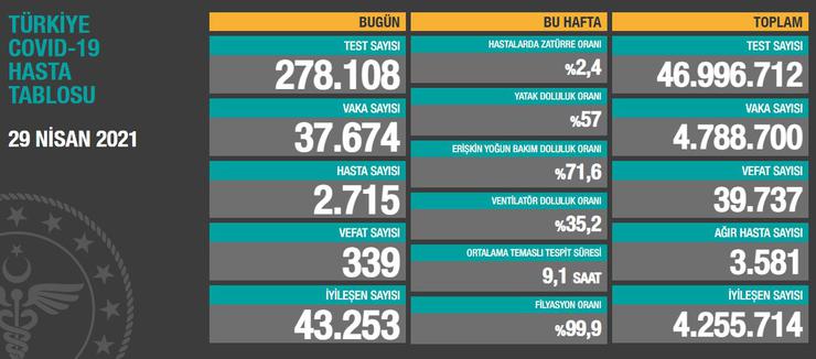 Türkiye Günlük Koronavirüs Tablosu, "covid19.saglik.gov.tr" adresinden paylaşıldı. Buna göre, Türkiye'de son 24 saatte 278 bin 108 Kovid-19 testi yapıldı, 37 bin 674 kişinin testi pozitif çıktı, 339 kişi yaşamını yitirdi, hasta sayısı 2 bin 715 oldu.