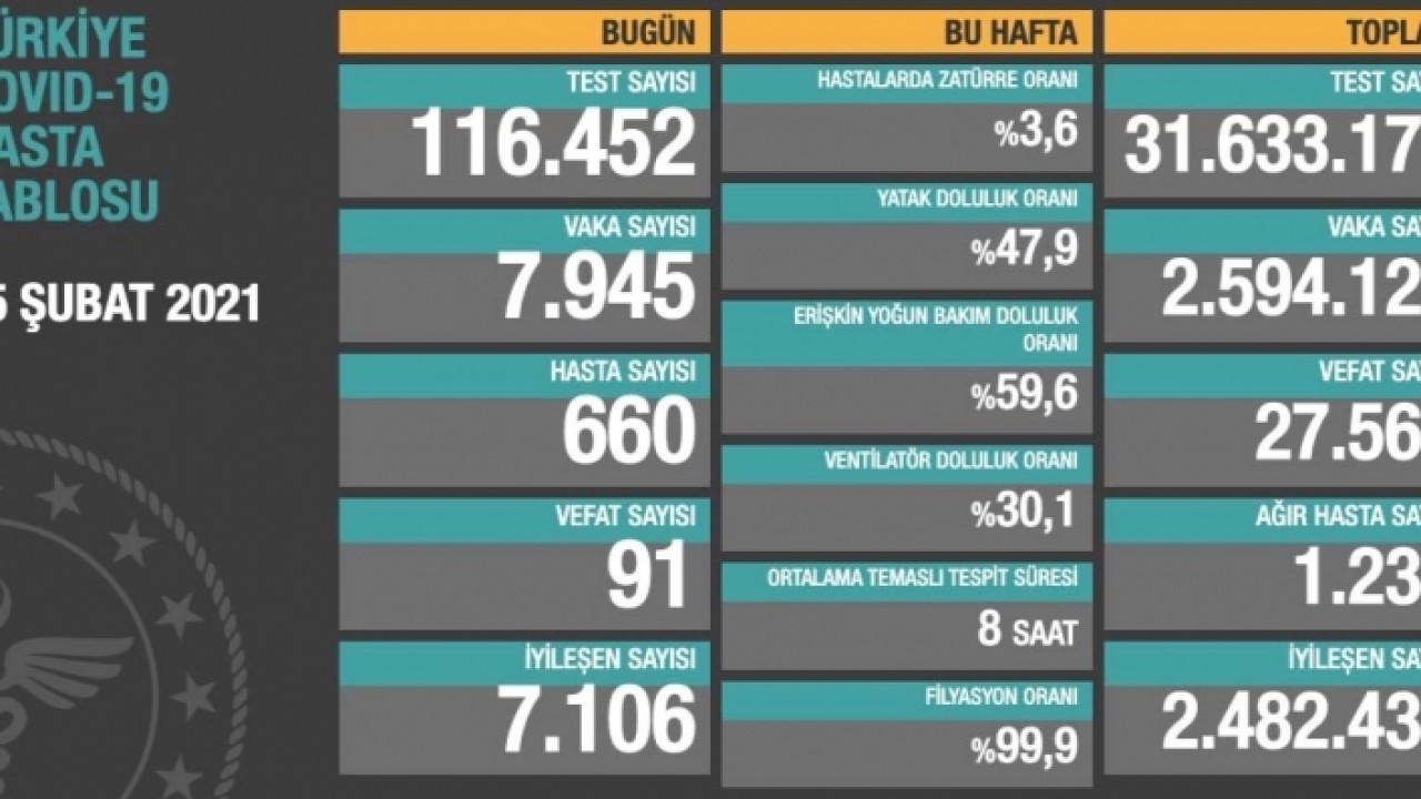 Sağlık Bakanlığı günlük koronavirüs tablosunu yayınladı. Yayınlanan tabloya göre Türkiye'de son 24 saat içerisinde 116 bin 452 kişiye koronavirüs testi yapılırken 7 bin 945 kişiye koronavirüs teşhisi konuldu.