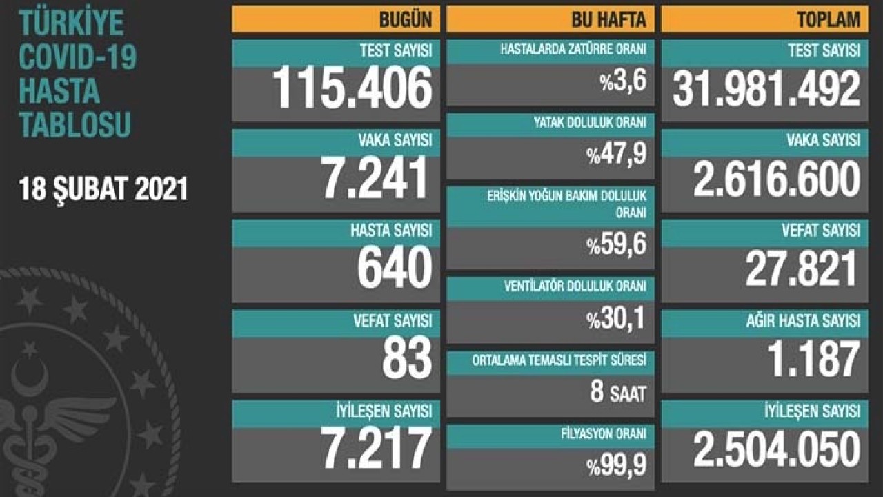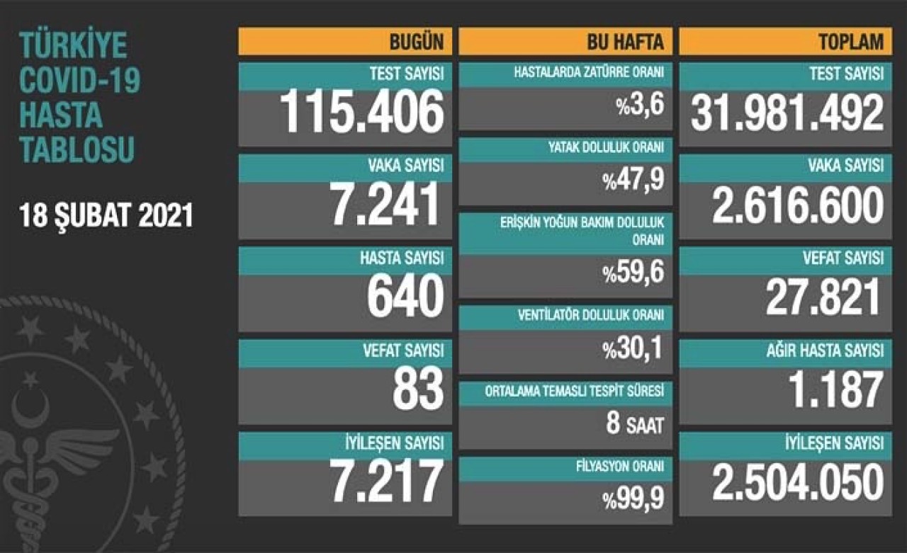 7 bin 241 kişiye koronavirüs teşhisi konulurken 640 kişi hasta oldu. 7 bin 217 kişi de iyileşti.