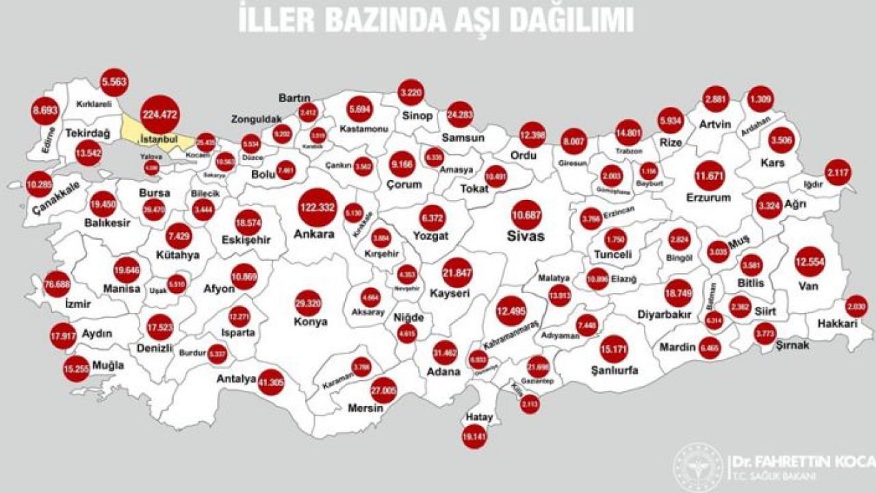 Sağlık Bakanı Fahrettin Koca, sosyal paylaşım sitesi Twitter üzerinden yaptığı paylaşımda, “1 milyon 200 binden fazla kişi şu ana kadar aşı oldu. Türkiye’de iller bazında aşı dağılımını görebilirsiniz. Pazartesi gününden itibaren bunu canlı olarak takip edebileceksiniz. En çok sağlık çalışanımızın bulunduğu İstanbul’da 224.000’den fazla kişi aşı oldu” ifadelerini kullandı. Bakan Koca ayrıca paylaşımına Türkiye’deki Covid-19 aşılama haritasını da ekledi.